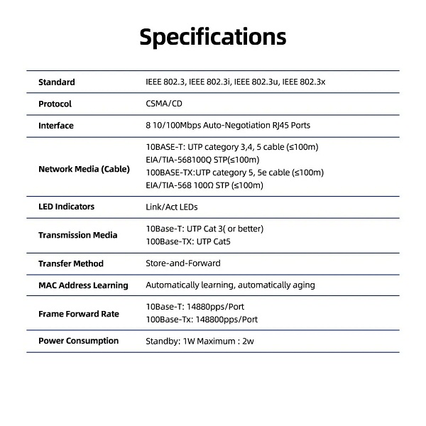 Interface: 8 * 10/100Mbps RJ45 Ports