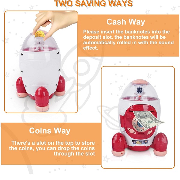 Rocket-Shaped Design: Propel your child’s creativity to new heights with this rocket-shaped piggy bank. Its sleek and vibrant design captures their attention, encouraging them to explore the world of saving money with enthusiasm and wonder.