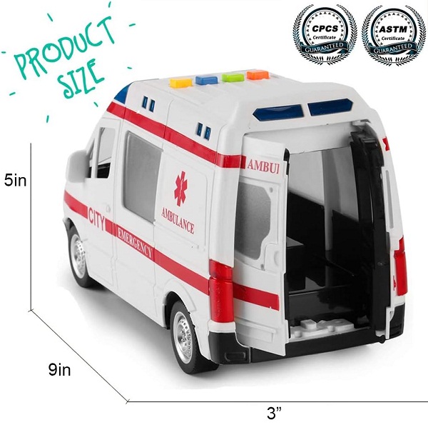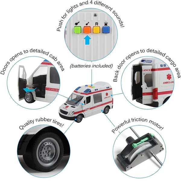 Awesome High Quality Friction Powered Ambulance with Dazzling Lights and Siren Sounds. Just simply pull and remove the plastic protector from where the batteries are in this vehicle, and you’re ready to go!Works on push and go power and includes realistic 4 button sound effects and flashing lights that kids will absolutely love.
