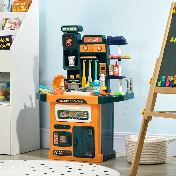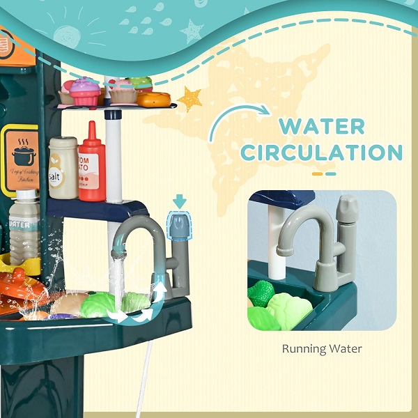 Water Circulation: This toddler kitchen uses a real water circulation system. Little chefs can wash dishes and toy vegetables in the sink while cooking. When playtime fun is done, several shelves and cabinets offer spacious storage for many play cooking items.