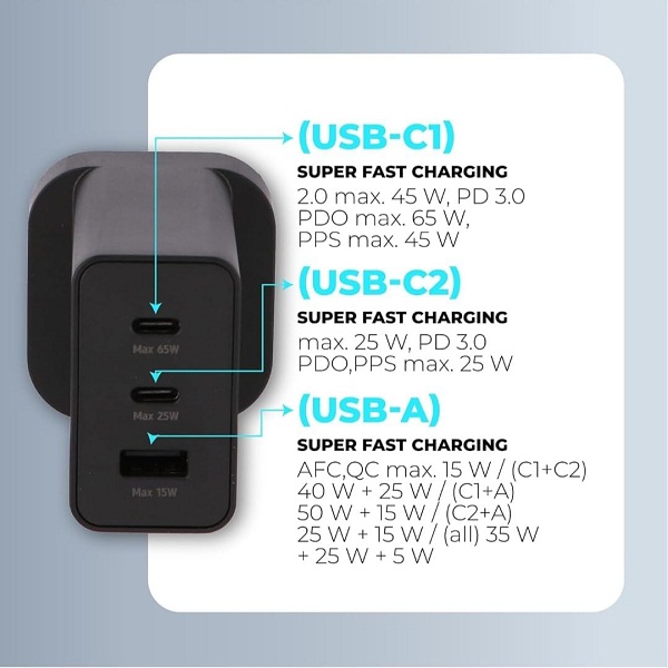 Output USB-C1: Super fast charge 45W max, PD3.0 PDO 65W max, PPS 45W max