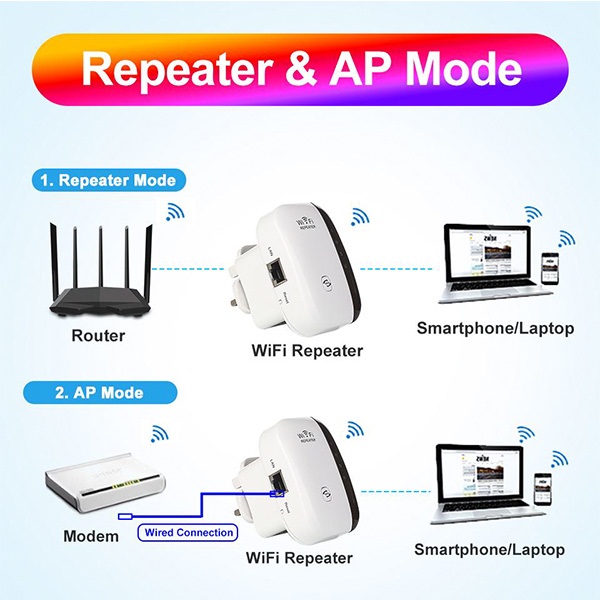 Wireless ap Mode: You will need broadband Router internet access, Connect the wifi repeater to your router/switch with RJ-45 Cable.